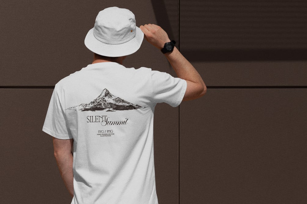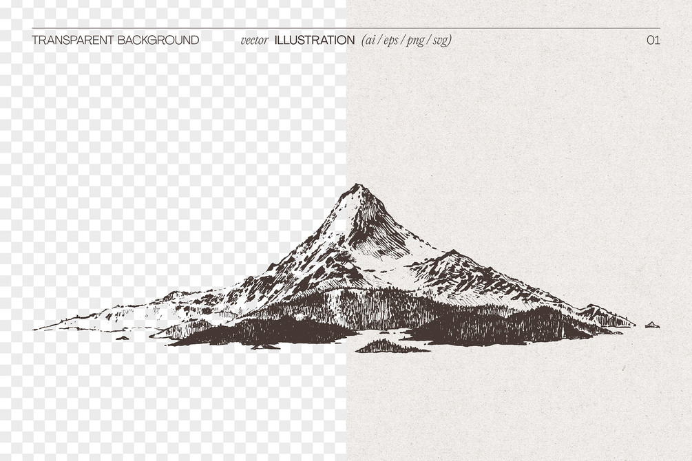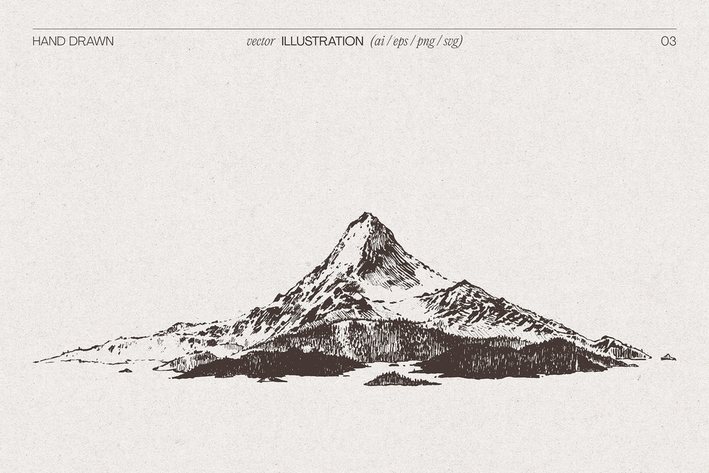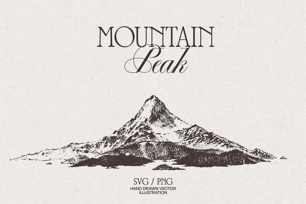 This detailed mountain illustration brings stillness and elevation to your design. Carefully sketched by hand, this single vector drawing is ideal for branding, apparel, posters or packaging with a quiet, vintage spirit. Use it where you want to add clarity, contrast and natural texture.