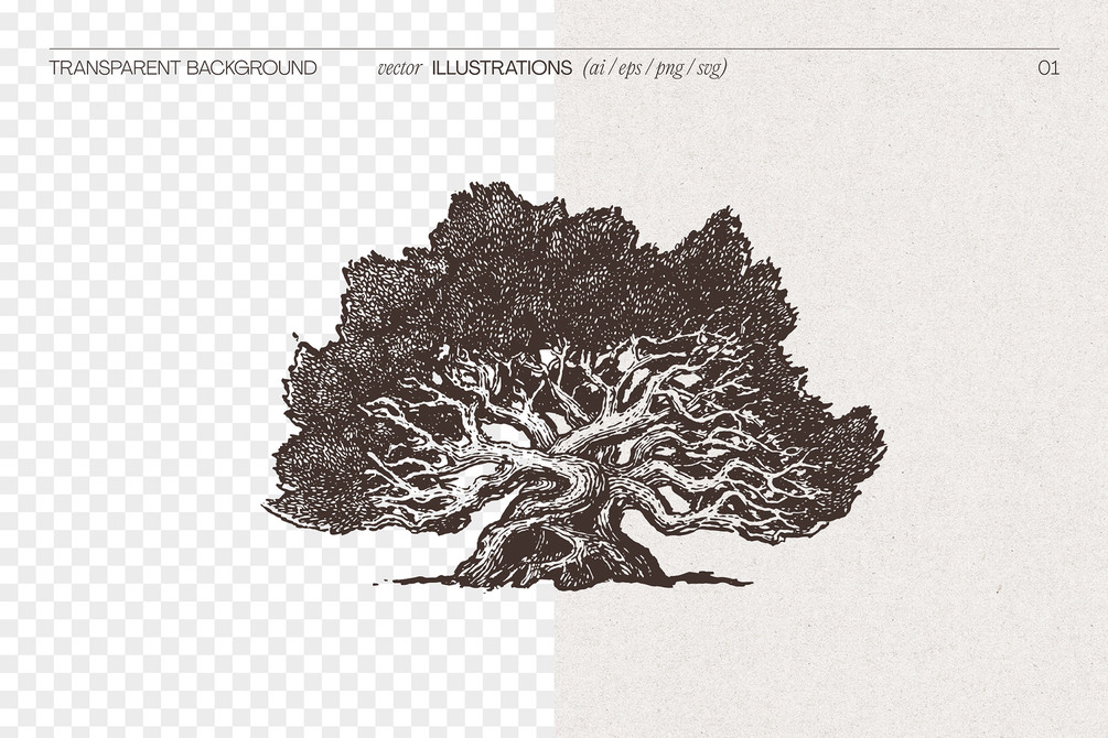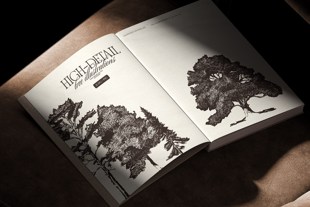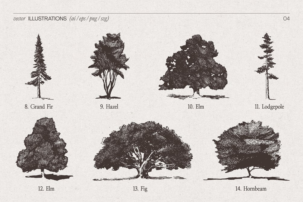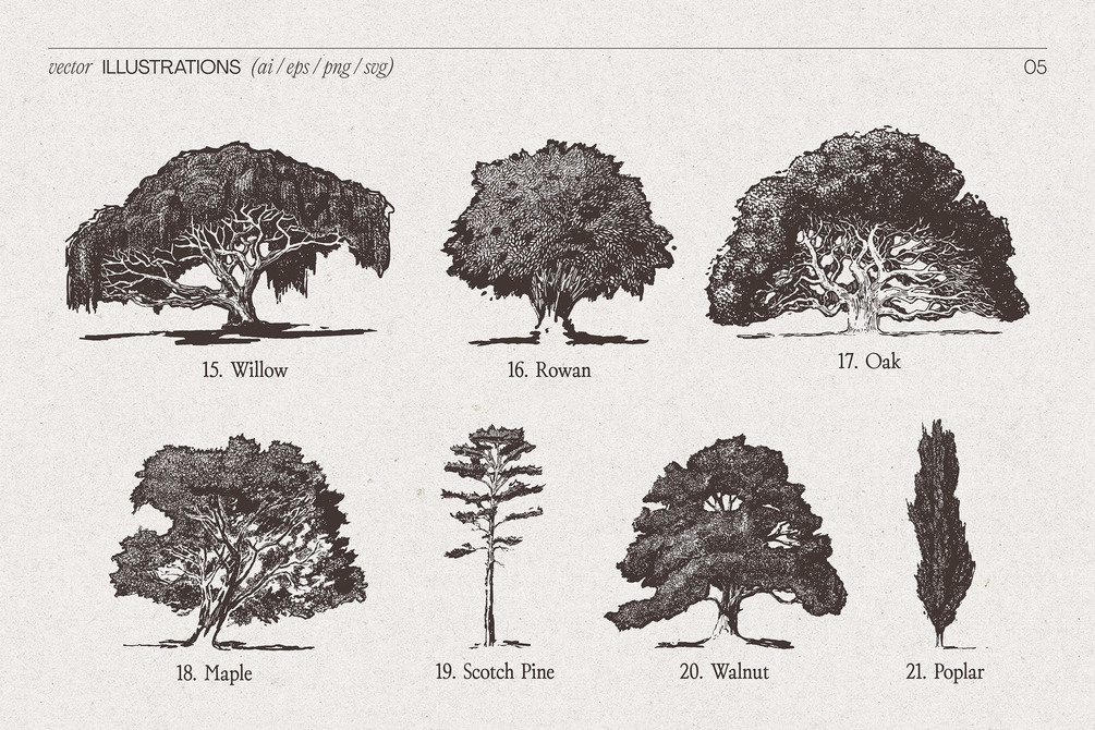 A timeless collection of 21 high-detail tree illustrations, meticulously hand-drawn and digitized into scalable vector formats. Each tree is crafted with careful attention to texture, shape and natural presence, perfect for refined design work in branding, packaging, stationery, editorial, landscaping visuals or botanical themes.
