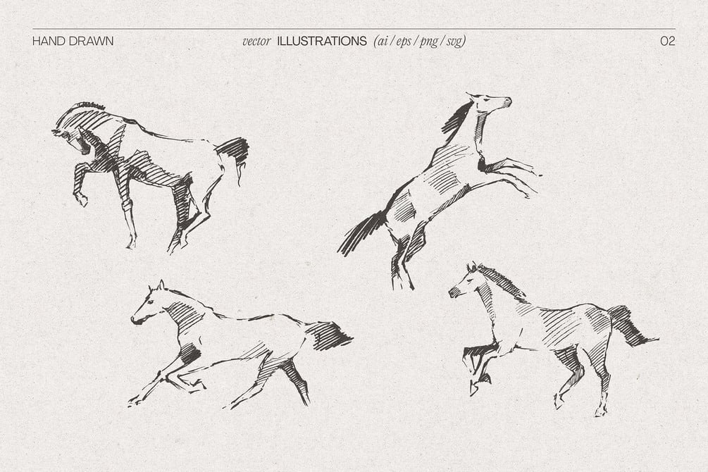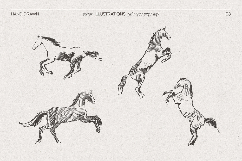 A graceful tribute to motion and strength. This collection of 12 hand-drawn horse sketches captures the energy of galloping, leaping and rearing movement with expressive linework. Perfect for branding, packaging, posters or editorial design where you need a timeless equestrian touch.